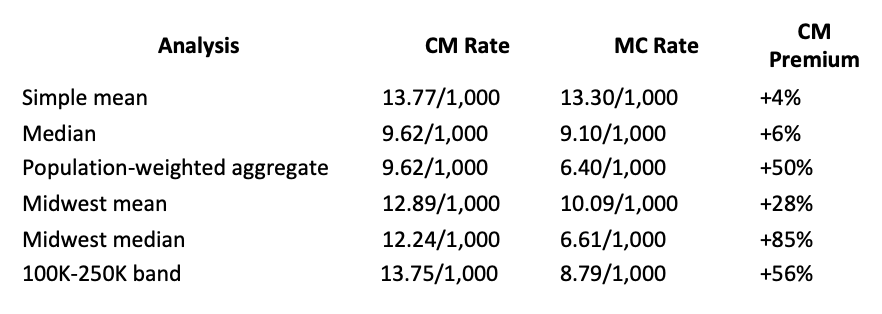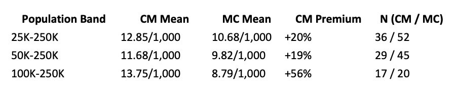 (5) 100K-250K: 17 CM cities, 20 MC cities. CM mean 13.75/1,000. MC mean 8.79/1,000. Difference: +56%.
