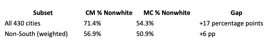 (6) Racial composition: 430 matched cities. CM 71.4% nonwhite, MC 54.3% nonwhite. Gap: +17pp.