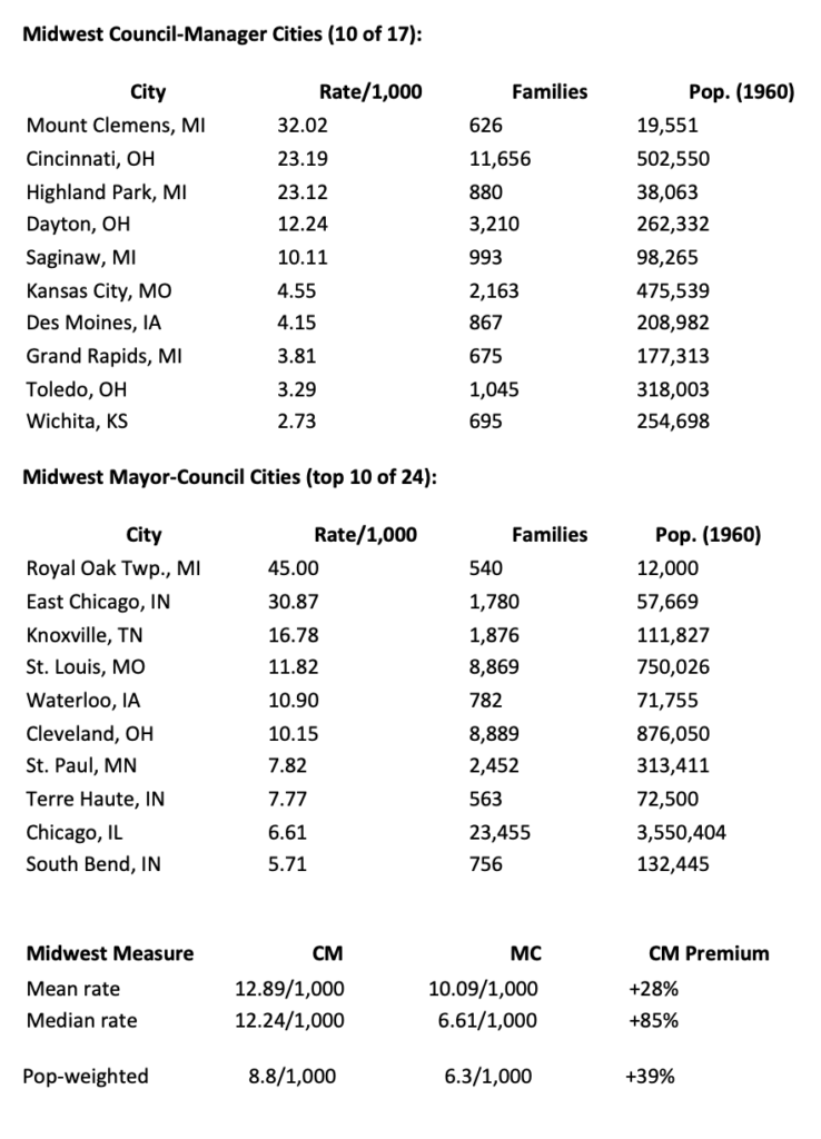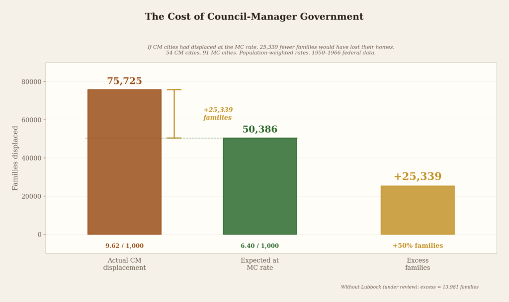 Cincinnati — a council-manager city — displaced 11,656 families at a rate of 23.19 per 1,000. Ninety-six percent of them were nonwhite. Chicago — a mayor-council city with eight times Cincinnati’s population — displaced 23,455 families at a rate of 6.61 per 1,000. The absolute number was larger. The rate was less than a third of Cincinnati’s.