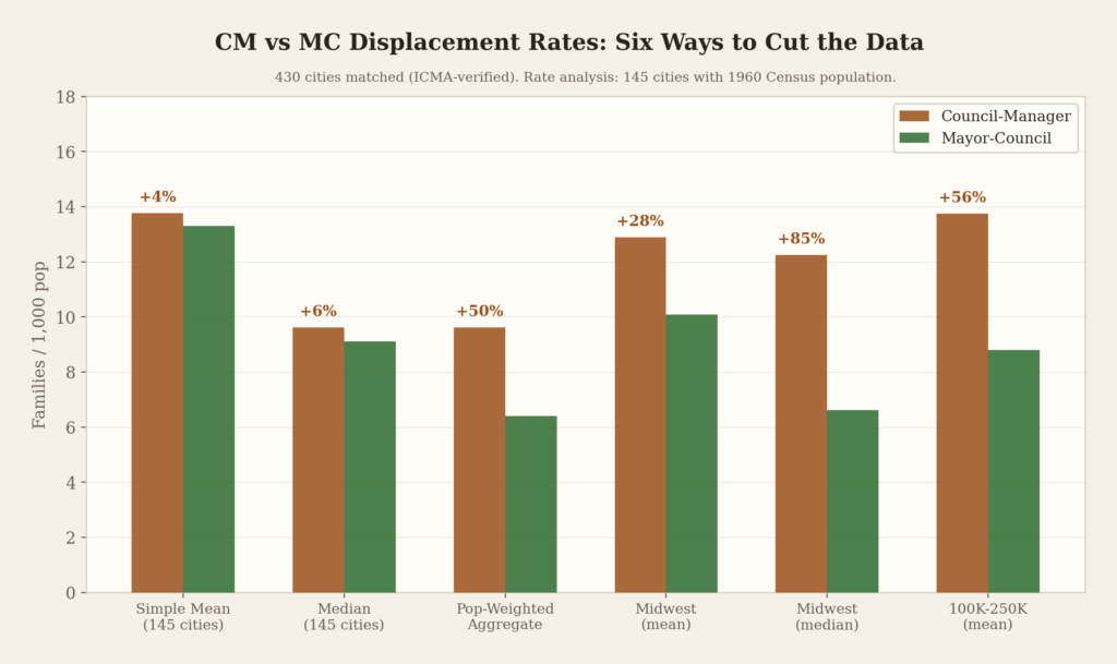 The population-weighted rate asks how many people were affected. It weights each city by population, so that Cincinnati’s 502,550 residents count more than Mount Clemens’s 19,551. CM cities displaced 9.62 families per 1,000. MC cities displaced 6.40. A 50% premium.(3)