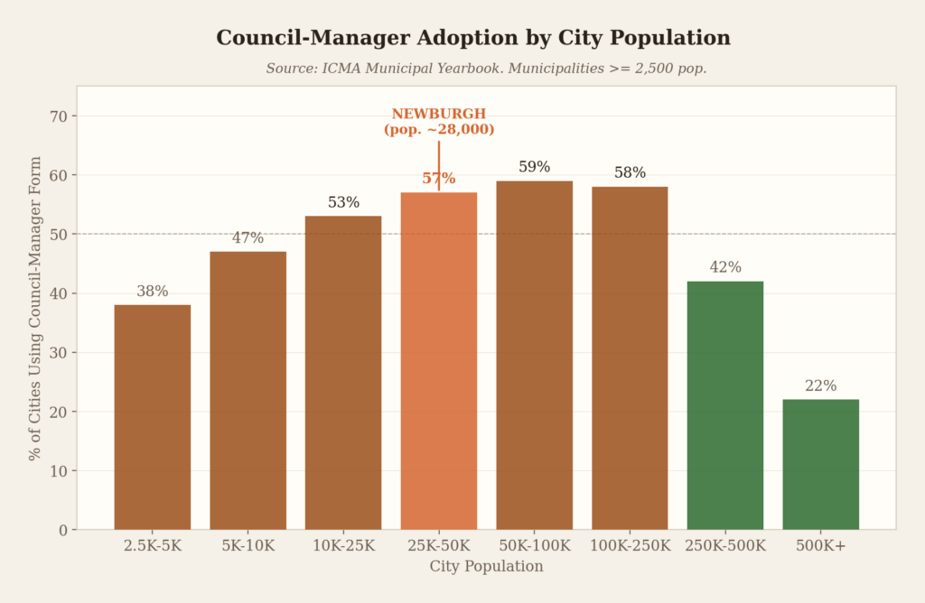 Newburgh, with a 1960 population of 30,978, sits squarely in the band where council-manager government is most prevalent.
