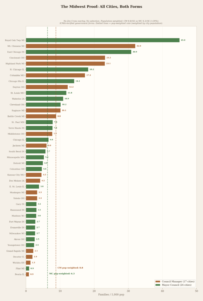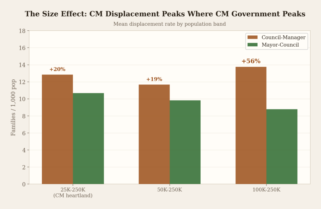 In cities of 100,000 to 250,000 — the sweet spot — council-manager cities displaced families at 56% higher rates than mayor-council cities. Seventeen CM cities against twenty MC cities. The gap is enormous.(5)