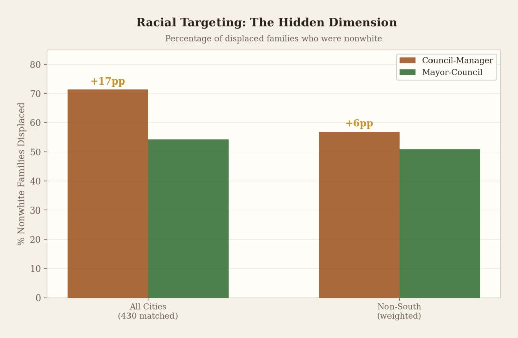 Across all 430 matched cities, 71.4% of families displaced in council-manager cities were nonwhite, versus 54.3% in mayor-council cities. A 17-percentage-point gap.(6)