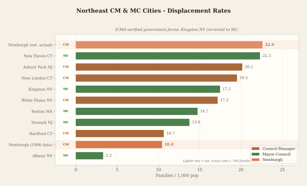 Among Northeast cities over 10,000 population, Newburgh’s estimated actual rate of 22.6 per 1,000 would place it first among council-manager cities — above Asbury Park, New Jersey (20.15), New London, Connecticut (19.51), and White Plains, New York (17.17). It would also exceed New Haven, Connecticut (22.29), the mayor-council city most associated with urban renewal in the American imagination, the city where the phrase was practically defined under Edward Logue.(14)