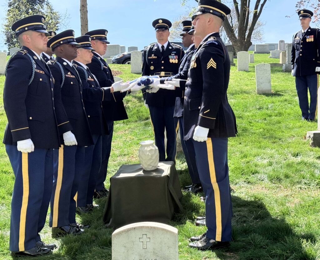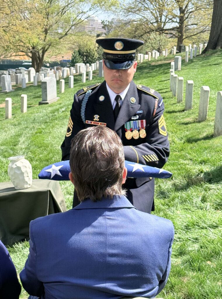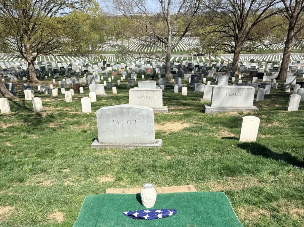 We walk up a short hill, to Section 8: one of the historic areas of the cemetery, where the bulk of World War II veterans rest. Then down a little. Grave 105. I look out. Rey – and his wife Betty – will have a view of the Lincoln Memorial and the Washington Monument. Section 8 is one of the oldest parts of the cemetery — Jimmy Doolittle of the 1942 Tokyo raid lies nearby, as do William and Elizebeth Friedman, the husband-and-wife cryptologists who broke the Japanese Purple code, and Frank Crilley, the Navy diver who earned the Medal of Honor for a rescue at 250 feet. Rey is in that company now.