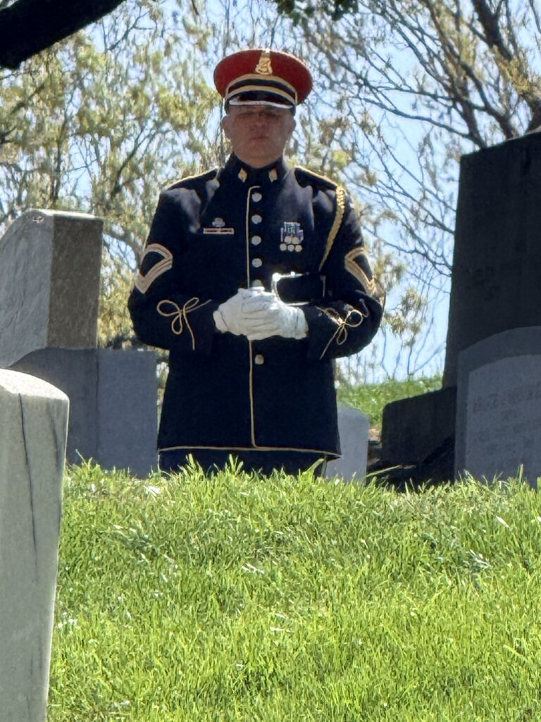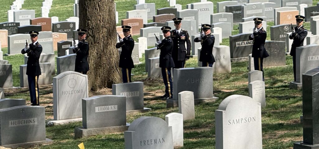 Have you ever been to Arlington? I hadn’t. And I have to say: it hits you the moment you step out of the car. Rows and rows and rows and rows and rows of markers. I was tearing up and even shaking a little and I hadn’t even found the rest of my family yet. I’m directed towards the visitor center but I spot my cousin Ken — whom I hadn’t seen in decades (the cost of the mobility of modern life in the U.S: scattered relatives across the continent) — and his family approaching. There were a dozen of us. Once together, we are taken to the burial site.